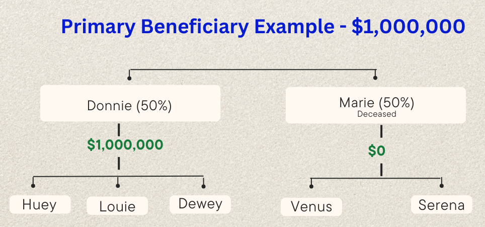 Same example as before: Donnie and Marie are each named 50% primary beneficiaries of your $1,000,000 account.