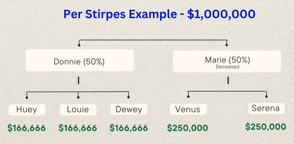 Remember, per stirpes follows the family line, which is why Venus and Serena split Marie’s portion.